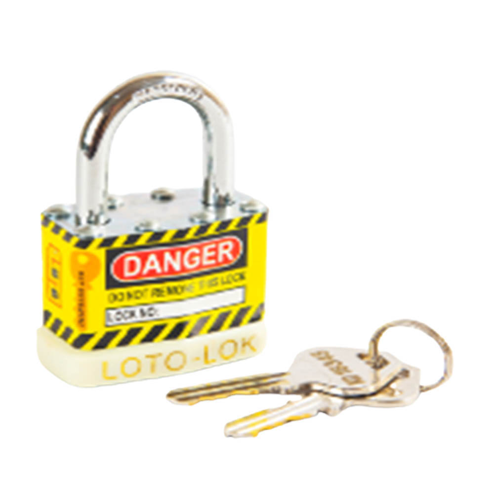 Loto Lok 2PTPSWKDS24 Laminated Steel Safety Lockout Padlock White Laminated Steel Safety Lockout Padlock, Steel Body, REGULAR Shackle, with WHITE color Bumper. Laser engraved Key No. on Key and padlock body for easy identification.