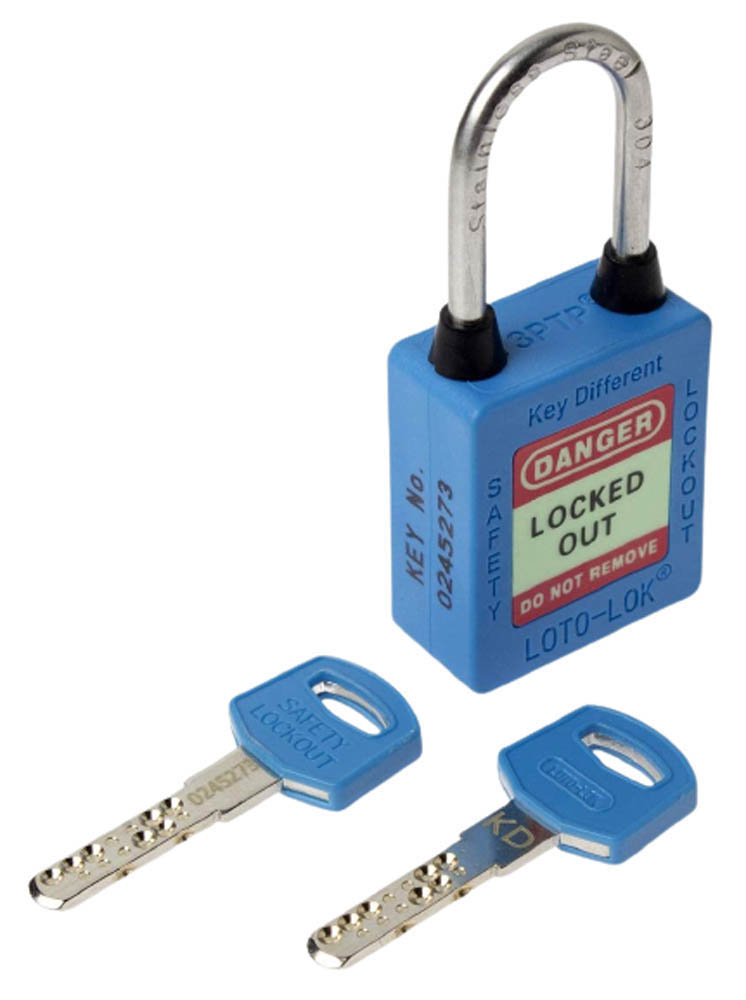 Loto Lok 3PTPBKDN40 3-PTP (Three Point Traceability Padlock) Blue Body made of high weather & temperature resistant NYLON PA66 material. Withstands 250 °C.SHACKLE made of Nylon PA66 extruded over Stainless Steel (SS304) DUAL PURPOSE (Electrical & Mechanical use), Non-Conductive (DUO 2in1), Rust, Shock & Weatherproof.