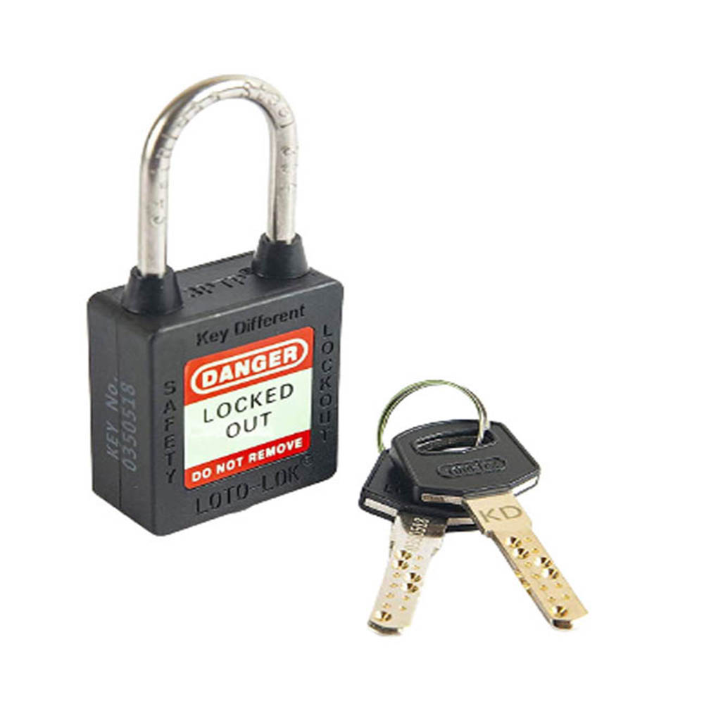 Loto Lok 3PTPNKDN40 3-PTP (Three Point Traceability Padlock) Noir (Black) Body made of high weather & temperature resistant NYLON PA66 material. Withstands 250 °C.SHACKLE made of Nylon PA66 extruded over Stainless Steel (SS304) DUAL PURPOSE (Electrical & Mechanical use), Non-Conductive (DUO 2in1), Rust, Shock & Weatherproof.