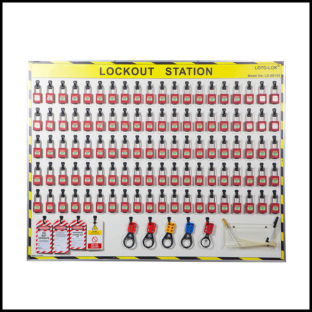 PPC board with Aluminium alloy frame, durable & strong nylon hooks for hanging Padlocks, Hasps and Tags complete with 100 Padlocks, 5 Hasps + 40 Tags + Cable Ties + 1 Acrylic pocket for pens, clips & screwdrivers.