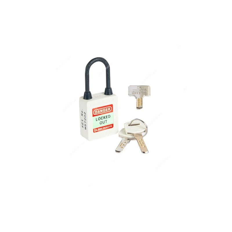 Body made of high weather and temperature resistant. Shackle made of Nylon extruded over Stainless Steel (SS304) Dual Purpose (Electrical and Mechanical use), Non-Conductive (DUO 2in1), Rust, Shock and Weatherproof. Key system is molded on padlock body and laser engraved on key. Visible key system allows user to initiate immediate action for lost or misplaced keys. Key number permanently laser engraved on padlock body and key permits quick traceability of Key to Padlock. Color coded key jackets reduces downtime identifying keys to different color padlocks. Note: Master Key quoted separately. Items Included: 1x Lock, 2x Keys.