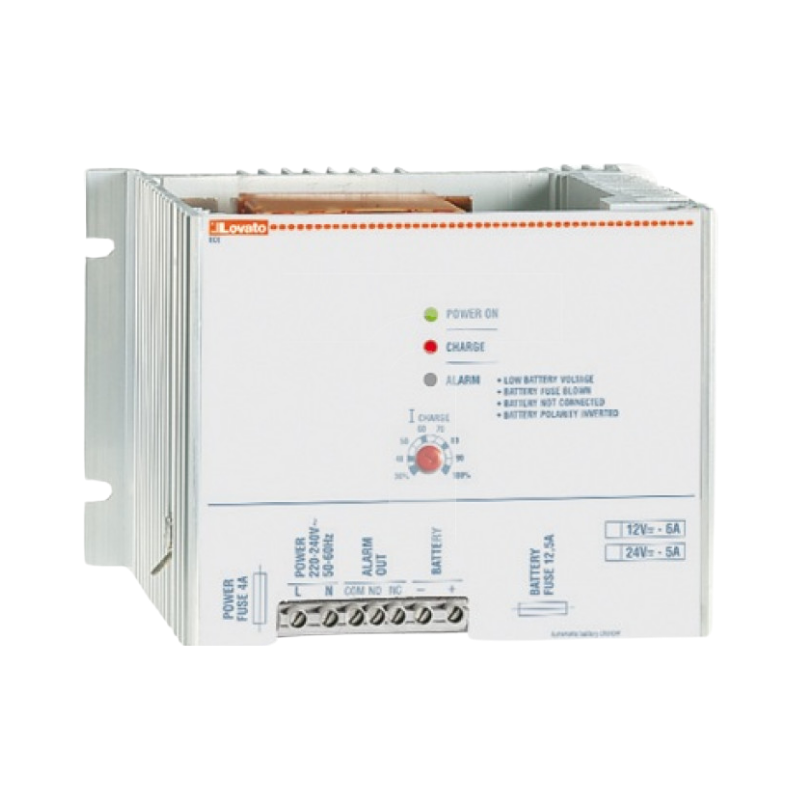 Lovato 31 BCE 0312 battery charger features 12V 3A output, 6-stage charging process, and protection against short-circuit/overheating. IP20 rated enclosure with LED status indicators. Designed for automotive and industrial applications.