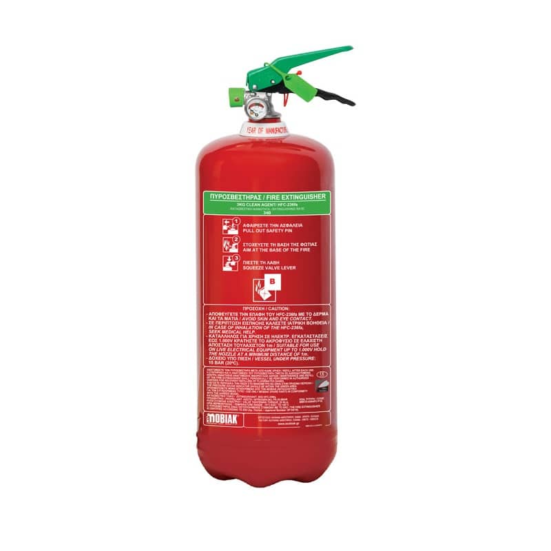 Mobiak 3kg FE36 Clean Agent Extinguisher with an aluminum body. Seamless aluminum alloy body, manufactured by deep drawing, with plastic foot ring to avoid contact with the ground, available on request. External coating in polyester resin, Mild steel, zinc-plated wall bracket suitable for vertical mounting.