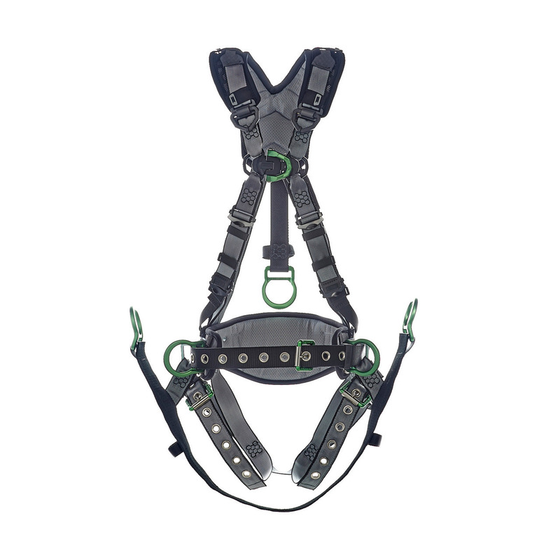 V-FIT Derrick Harness Standard with Back chest & Hip D-Rings,Tongue Buckle Leg Straps, Shoulder Padding. The MSA V-FIT full body safety harness allows you to focus on your job – not your harness. Featuring a patent-pending RaceFLEX buckle, bulky chest straps are eliminated for a close and comfortable fit. The athletic cut of the V-FIT harness contours to the body, improving upper torso movement on the job, while soft shoulder padding helps to eliminate pressure points and chafing for all day comfort.