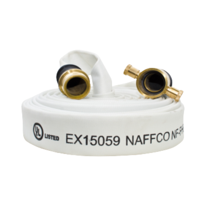 The NAFFCO NF-FH38 is a 1½” (38mm) diameter fire hose, 30 meters in length, featuring a single jacket construction made from high-tenacity polyester yarn. It is lined with a thermoplastic material, ensuring flexibility and resistance to chemicals, ozone, and UV. The hose comes equipped with couplings, making it ready for immediate installation in interior standpipe systems. Compliant with UL 19 and NFPA 1961 standards, it is suitable for commercial and industrial fire protection applications.