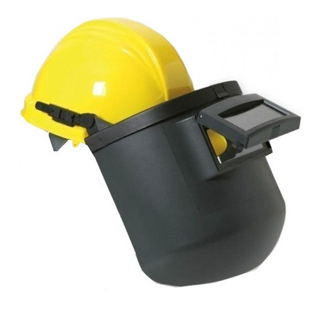 Full size helmet with fully adjustable headgear and flip up glass holder.