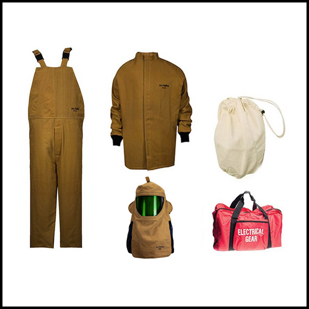 Includes the following items per Kit: , 100 CAL ARCGUARD NOMEX/KEVLAR ARC FLASH COAT, 100 CAL ARCGUARD NOMEX/KEVLAR BIB OVERALLS, 100 CAL ARCGUARD NOMEX/KEVLAR ARC FLASH HOOD with 2 VENTILATING Fans, Faceshield Unit Bag, Duffle Tote Electrical / Gear Bag to store Arc Flash Kit with 2 carry handles Size: 62 x 32 x 37 cms