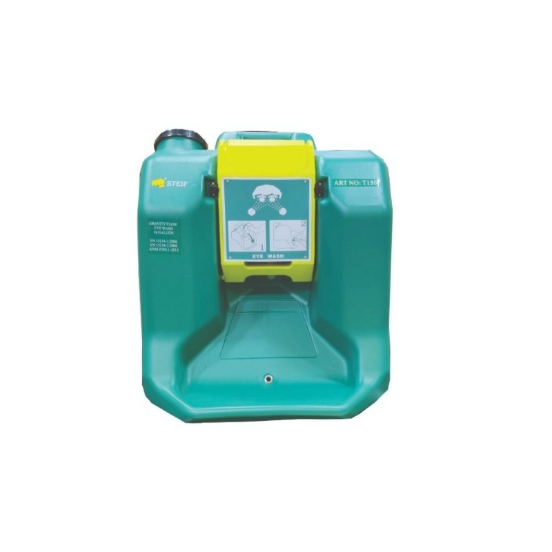 Portable Eyewash Station Steif 16 Gallon T150 has a Twin soft flow atomizer head with aerators to control the stream. The eyewash has an Acid and Alkali resistant ABS Plastic receptor bowl, Stay open ball valve with ABS Plastic push plate. Anti-corrosion powder-coated G.I pipe with push plate/foot pedal operated shower and Pull rod operated shower.