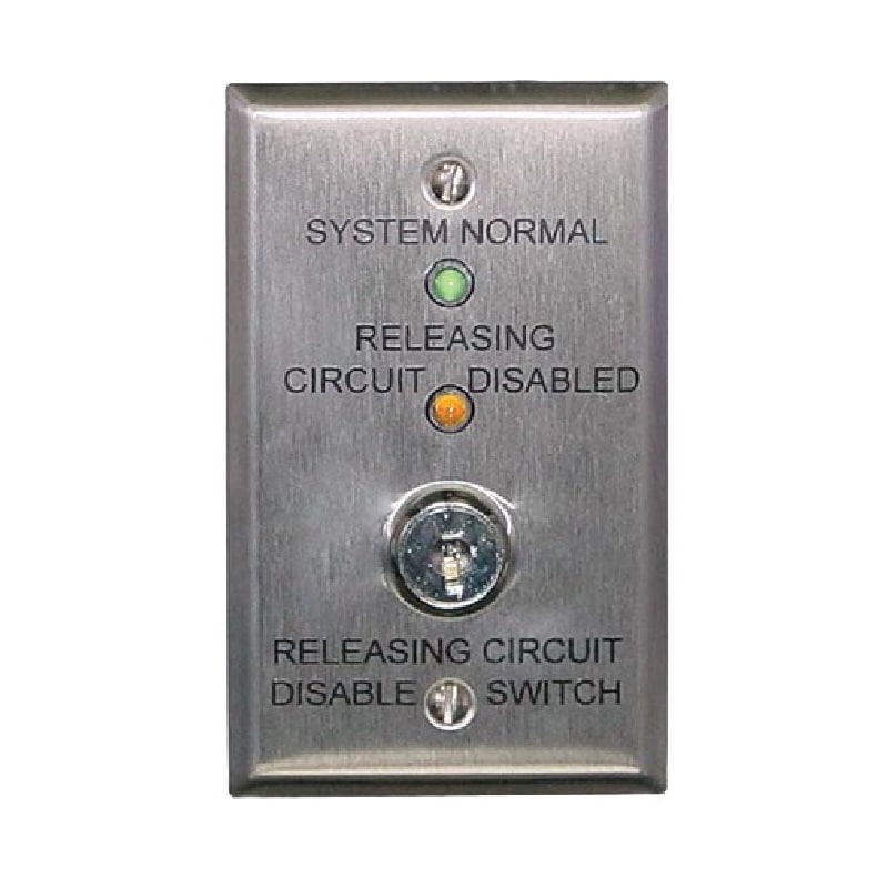 Potter RCDS-1 Releasing Circuit Disable Switch, the device consists of a stainless steel faceplate, a green LED, amber LED, and a switch assembly. It is designed to mount on a standard single gang electrical enclosure. The RCDS-1 complies with the requirements of NFPA 72 (National Fire Alarm and Signaling Code)