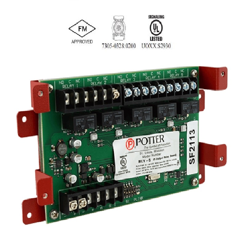 Poter RLY-5 relay expander is compatible for Potter fire alarm control panels. The RLY-5 communicates with the control panel via the RS-485 (P-Link) communication bus providing 5 user configurable relay outputs programmable with the Potter Configuration Software.