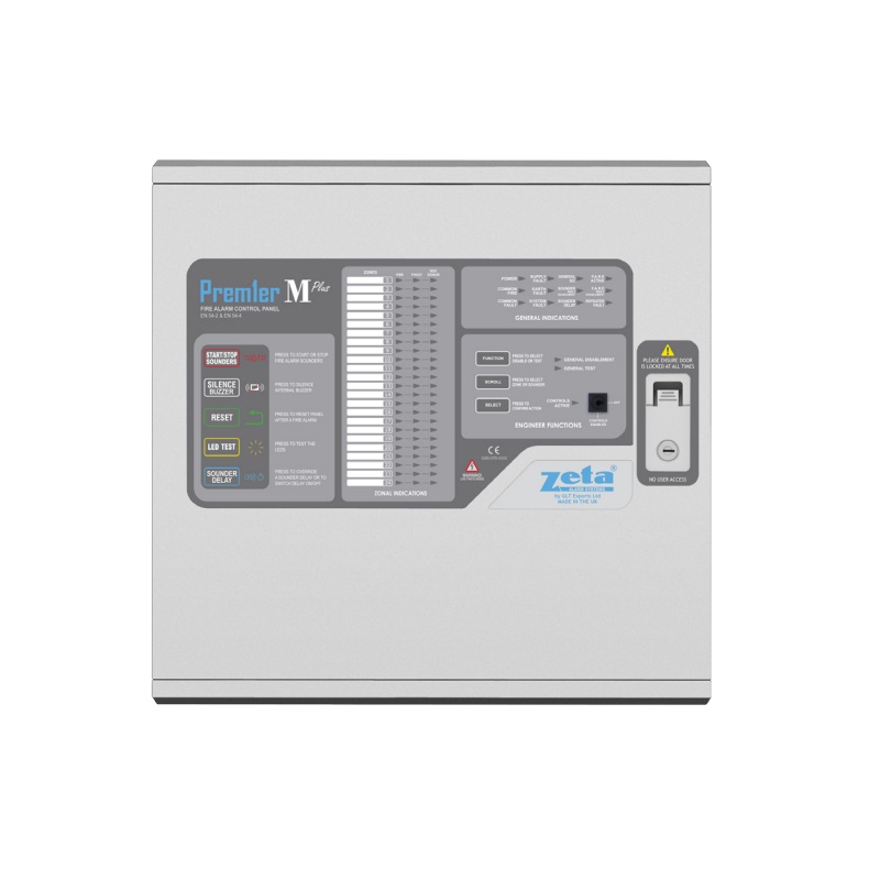 Premier M+ 16 Zone Conventional Fire Alarm Panel is designed to fulfill the requirements of EN54 parts 2 & 4 as well as being easy to install, operate, and maintain. Being of modular construction, the basic M Plus panel has 8 zone capacity, expandable to 16, 20, and 24 zones. The Premier M Plus is suitable for surface mounting or semi-flush fitting (with just the door protruding).
