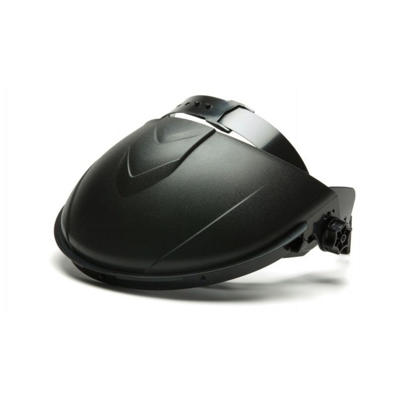 Constructed from durable nylon. Ratchet adjustment for easy fit. Pivoting action allows user to lift face shield while wearing. Adjustable pegs will accommodate a wide variety of face shields.