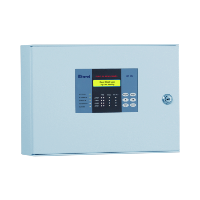 The RAVEL 4-zone conventional fire alarm panel features intuitive touch controls, real-time clock, and built-in event logger (10,000 events). Includes 2 sounder circuits (2A each), 7Ah battery backup, and supports all standard conventional detectors and modules. Complies with EN54-2/4 standards.