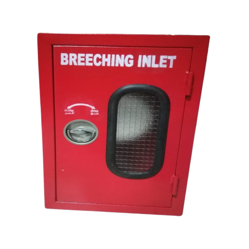 Recessed Type 4 Way Breeching Inlet Single Door Cabinet constructed of stainless steel hairline Brush finish with wired glass and MS Red Powder Coated Back Box. The cabinet has a thickness up to 8mm with the push pin hinges and Red powder coating finish