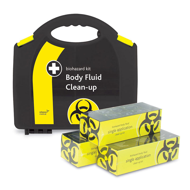 2 Application body fluid clean up spill kit in Small Black/Yellow Integral Aura Box. Available as 2 or 5 application kit. Everything required to clean up in one simple pack. Incident packs are individually boxed.