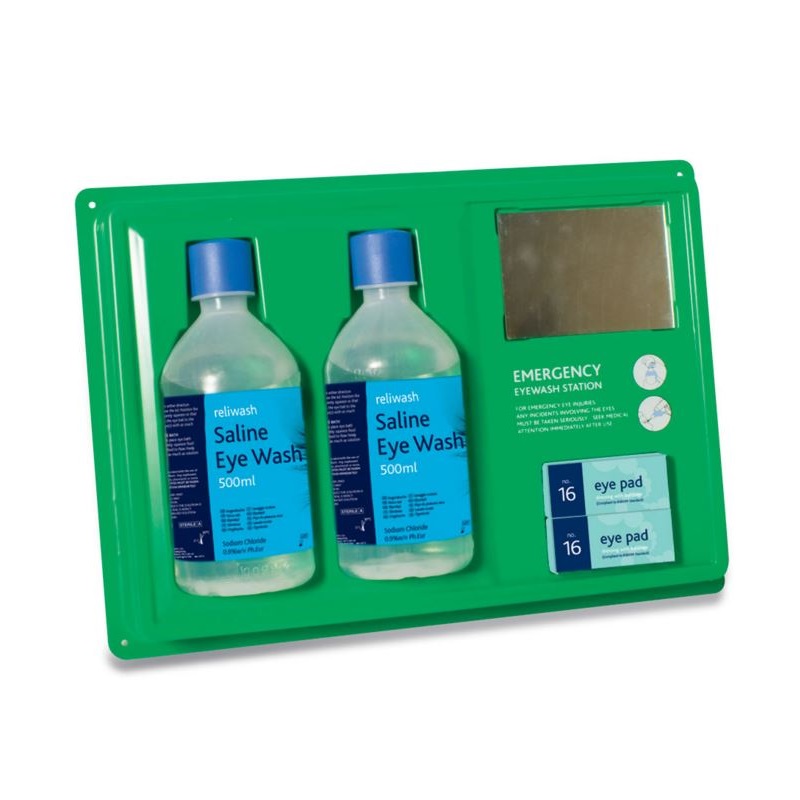 Reliance Medical Double Eye Wash Station Holds two 500ml sterile saline solution bottles Provides fast and effective treatment for minor eye injuries CONTENTS 2 Eye Pad Dressings 2 Eye Wash 500ml Bottles 1 Mirror