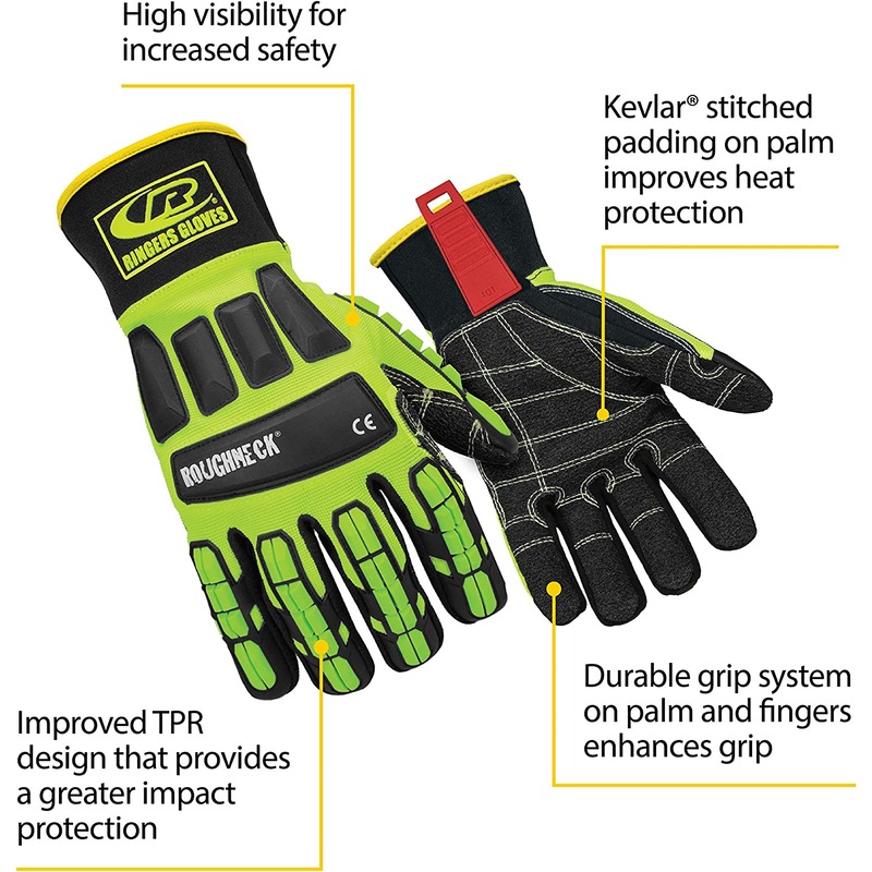 For extreme impact, cut and heat protection, choose Ringers Gloves R-297 Roughneck Durable Heavy Duty Work Gloves. These impact and cut-resistant gloves are made with TPR (Thermoplastic Rubber) protection on the top of the hand and down the full length of the fingers. They’re crafted with a highly visible material for increased safety on the job, and they carry a CE level 3 cut and puncture resistance. A Durable Grip System on the palm and fingers enhances grip when you need extreme control over material handling. The extended airprene wrist closure gives you a breathable glove with an excellent protective fit. These gloves feature Kevlar stitching with padding on the palm. Ringers Gloves develops work gloves with advanced technology and task-specific design, for a range of applications that require complete control, protection and reliability.
