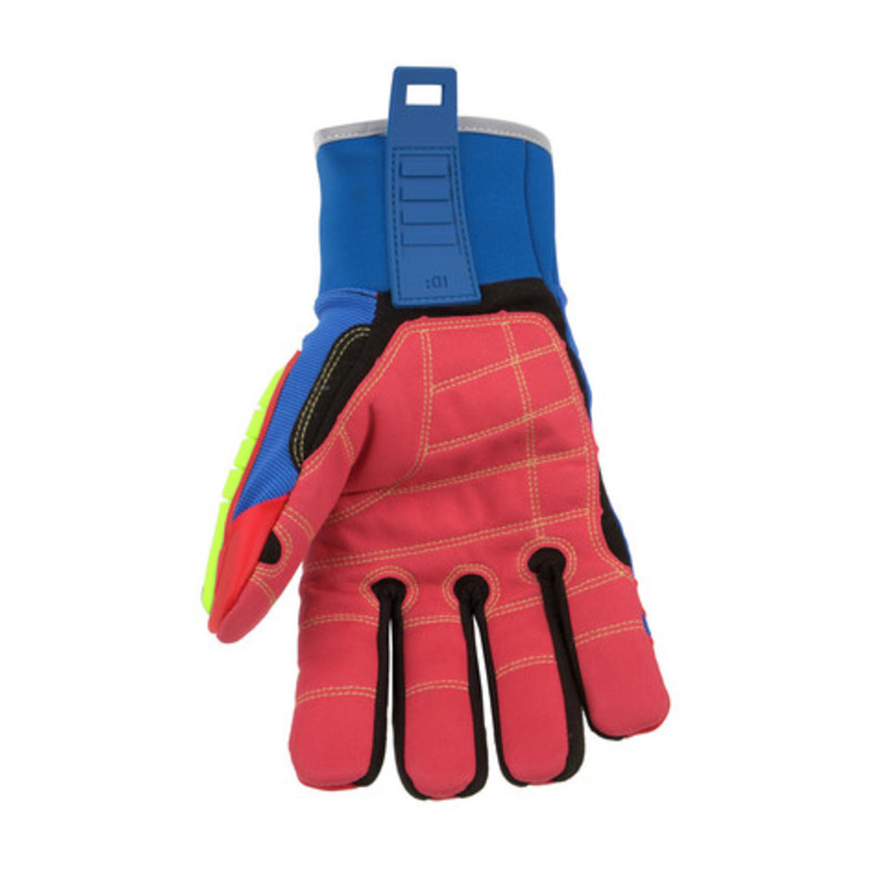 RINGERS? R259B impact gloves? patented TPR (thermoplastic rubber) design, developed with F3 Technology?, provides top-of-hand and finger-length protection. An additional palm layer enhances cut resistance, while a waterproof barrier and liquid-resistant coating at the top of the hand ensure dry, dependable personal protection. An additional palm layer enhances cut resistance, while a waterproof barrier and liquid-resistant coating at the top of the hand ensure dry, dependable personal protection. Their advanced construction includes a durable bond between each layer, limiting glove separation when doffing. A synthetic leather palm ensures superb grip. These RINGERS? gloves? high-visibility design, with reflective cuff piping, further enhances safety levels, while an extended neoprene wrist closure ensures a secure fit