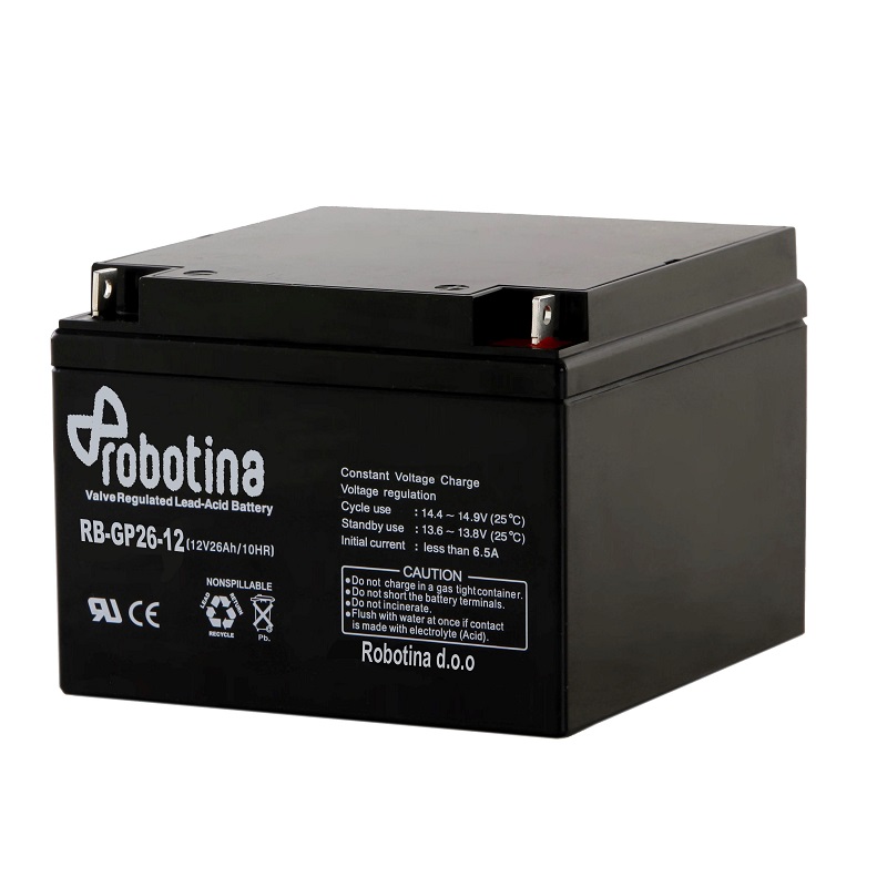 Robotina RB-GP26-12 Lead Acid Battery (AGM) 26Ah 12V provides high performance and long service life. Compliant with the IATA/A67 and IMDG/238 requirements for transportation, Safe and effective explosion-proof, and ventilation design. Non-spill able and maintenance-free, Available for side, vertical, or upright installation.