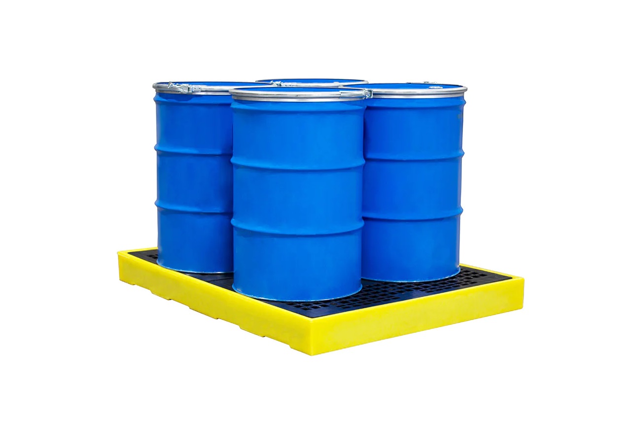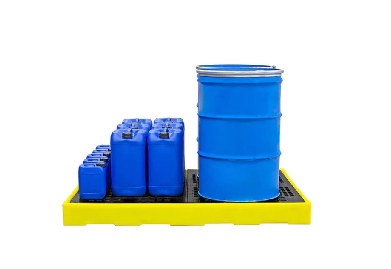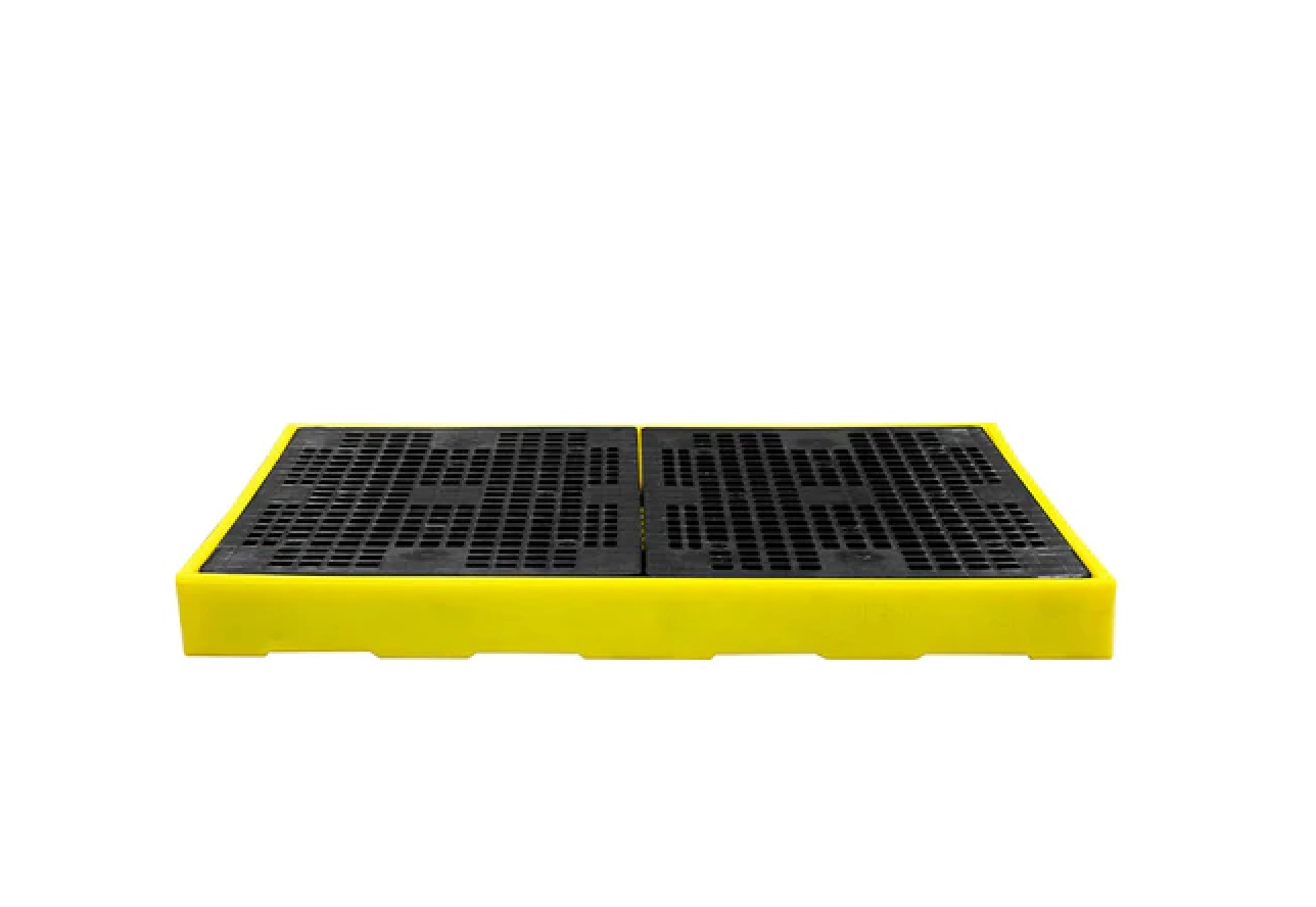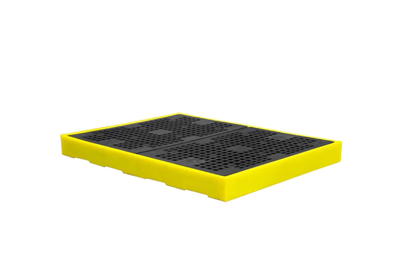 ROMOLD BF4 Sump Floor a low profile 4-drum sump floor is only 150mm high moulded from medium-density polyethylene that can be used as a stand-alone unit or combined with others to create unlimited bunded areas. Units can be joined together with plastic connectors to inter-link the sumps and the injection moulded mesh floor has a 2000kg static weight load.