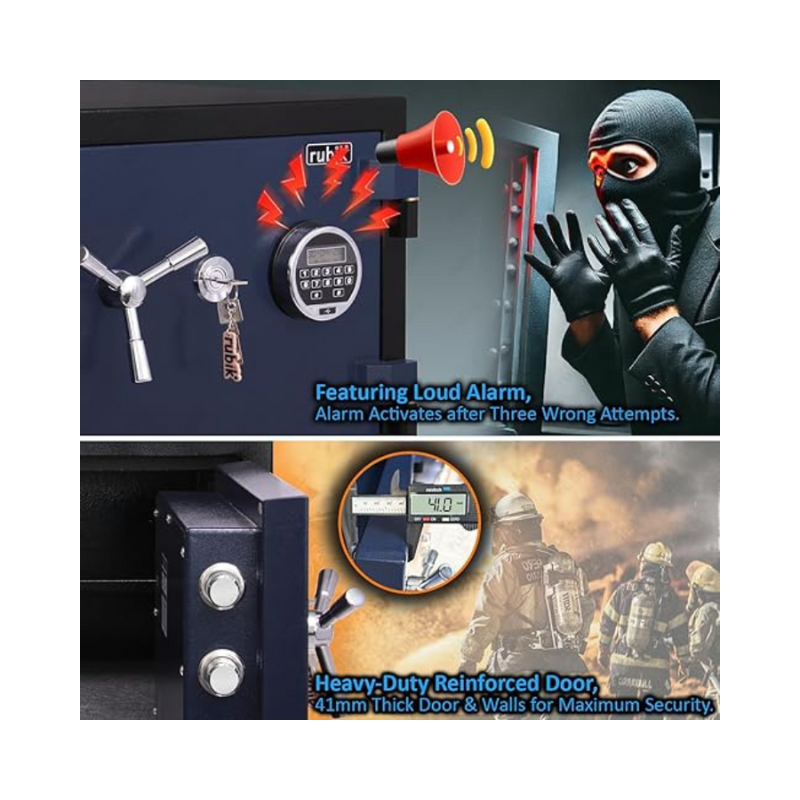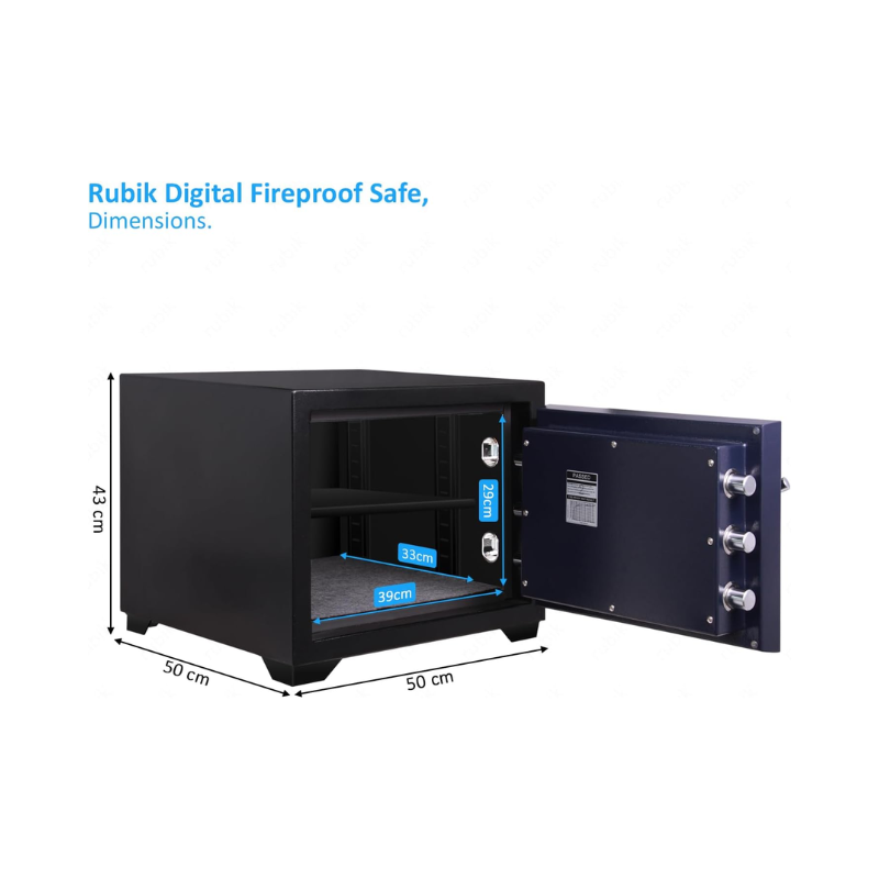 Rubik Fireproof Safe Box RBDF-430, 63Kg, Digital & Key Lock Operated, 2 Hours Fire Rated – Black/Blue is designed to offer strong protection for valuables against fire and theft. Constructed from high-grade steel and weighing 63Kg, this safe is built for durability and long-lasting security.