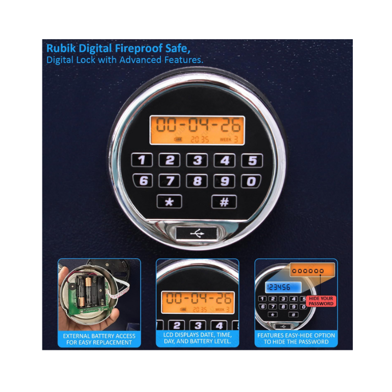 Rubik Fireproof Safe Box RBDF-580, 110Kg, Digital & Key Lock Operated, 2 Hours Fire Rated – Black/Blue is designed to safeguard valuables against theft and fire. Weighing 110Kg and built with heavy-duty steel, this safe offers durability and peace of mind.