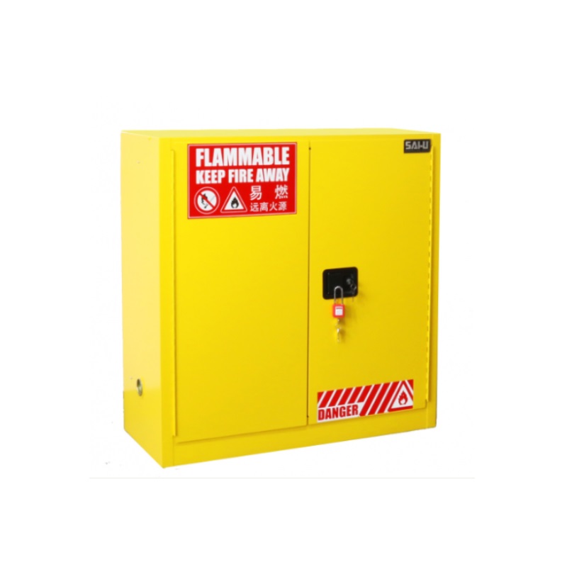 SAI-U SC0030Y Double Door Flammable Safety Cabinet (30Gal/114L), Yellow is designed to meet fire codes and safety regulations which helps reduce the risk of a damaging fire in your workplace. Economical Manual closing doors can be fully open 180 degrees, flexible and convenient,three-point linkage door device make the lock more stable. SAI-U safety cabinets are designed to safely store flammable fuels enhance fire safety through locking mechanisms and fireproof and explosion-proof vents.