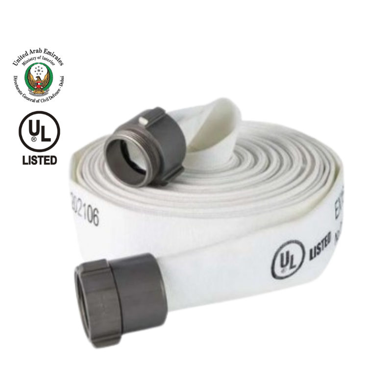 UL Listed 2-1/2″ multiple-jacket white fire hose with EPDM lining, rated 400 PSI.
