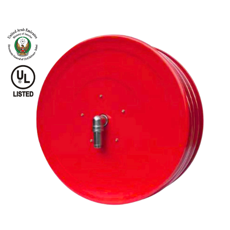 Manual fire hose reel with swinging arm, 25mm x 30m reinforced rubber hose, mild steel red drum, complete with plastic nozzle and 25mm ball valve. LPCB Approved.