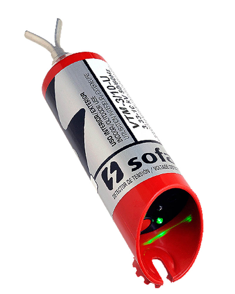 Electronic voltage detector with microcontroller and direct contact detection. New advanced technology acquisition guarantees a perfect and safe indication even in conflicting electric field environments. Voltage presence is indicated by high luminosity red LED and high acoustic pressure buzzer. Voltage absence is indicated by high luminosity green LED.