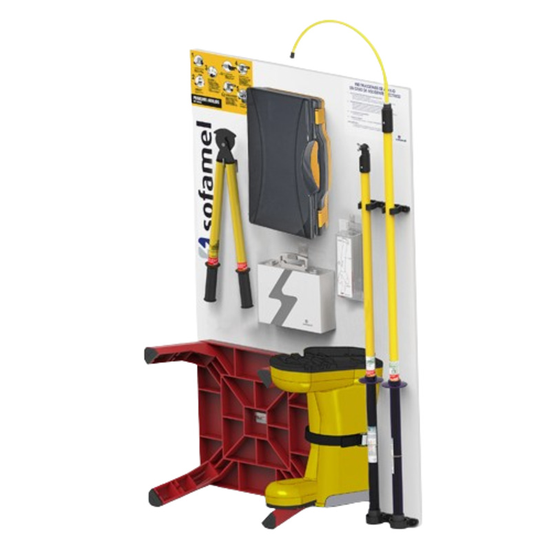 In the event of an electrical accident, speed of intervention is essential. This kit contains all the life-saving tools in one accessible location to allow rapid intervention when needed. Consists of a 1 x 1.6 m board with the following items: 1 36 kV insulating stool, 1 rescue pole BS-25 1 CTL-1000 professional multimeter with True RMS, 1 plastic box for gloves, 1 pair of class 0 gloves 1 60 cm x 1 m insulating mat with working voltage 1 kV, 1 pipette, 1 first aid diagram, 1 diagram with the five golden rules for automotive.