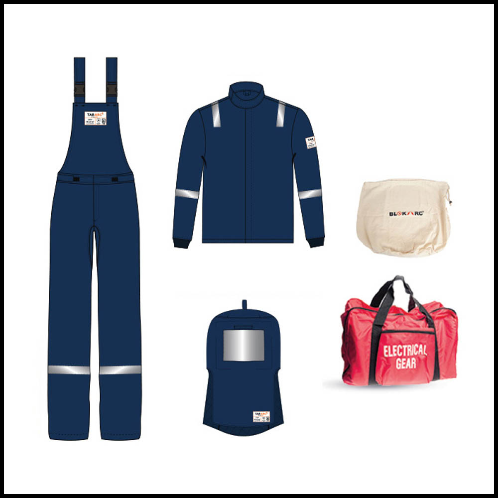 Kit includes the following items: 45 Cal Vallum BIB OVERALLS, 45 Cal Vallum 32″ LENGTH SHORT COATS, 45 Cal Vallum HOOD Hood With Fan, with HOOD BAG, Duffle Tote Electrical / Gear Bag to store Arc Flash Kit with 2 carry handles Size: 62 x 32 x 37 cms