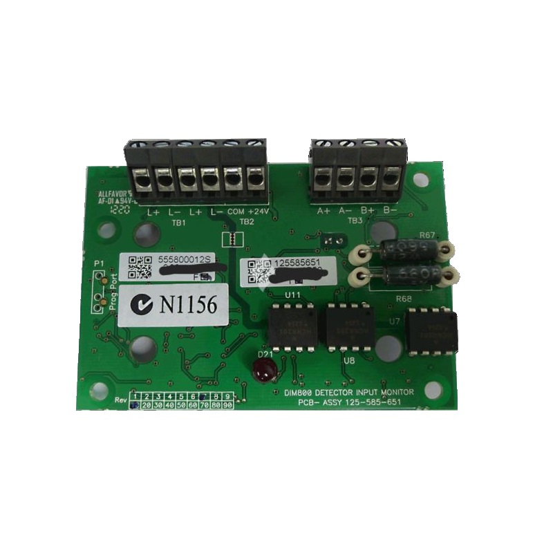 Tyco DIM800 Input Module Front Cover is designed to accommodate the DIM800. The DIM800 is supplied as an open PCB with mounting hardware and EOL resistor and must be fitted in a suitable enclosure. It may be mounted on a gear plate using plastic standoffs or to an M520 Ancillary Cover and K2142 backbox. The K2142 mounting box provides a convenient surface mounting enclosure and the M520. The DIM800 Detector Input Module interfaces two collective detector circuits onto the MX addressable loop. Each circuit can support 3mA of detector current and requires a 4k7 Ohm EOL (End Of Line) resistor. The DIM800 requires a suitably rated external 24V supply to power the detector circuits. A switched 24V output is provided to power detectors that have separate power supply terminals. The two circuits are mapped to the same addressable point; either circuit in alarm will put the point into alarm. Unused circuits must be terminated with an EOL.