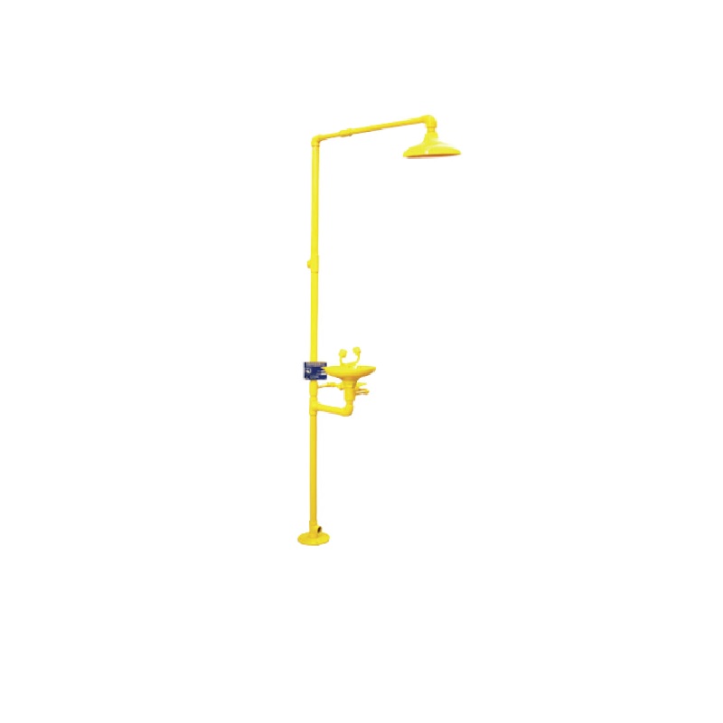 Vaultex 6250-GI Safety Shower Eye Wash Station with High drench shower head made of high visible yellow ABS Plastic. The shower has a Twin soft flow atomizer head with aerators to control stream. The eyewash has an Acid and Alkali resistant ABS Plastic receptor bowl, Stay open ball valve with ABS Plastic push plate. Anti-corrosion powder-coated G.I pipe with push plate/foot pedal operated shower and Pull rod operated shower.