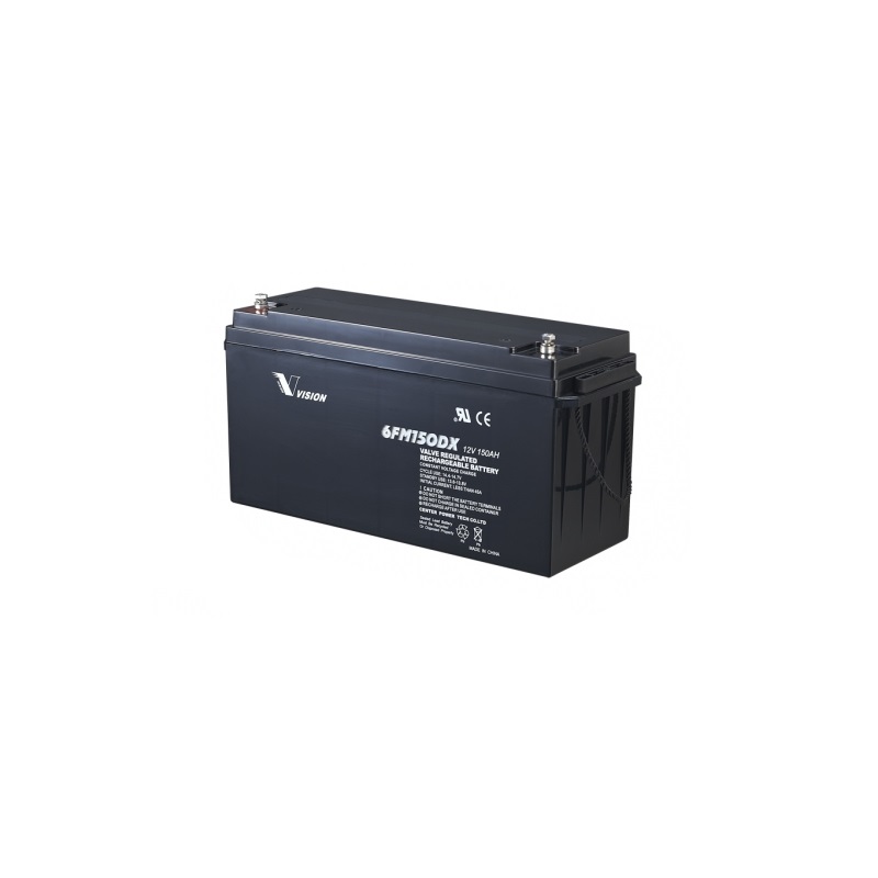 Vision 6FM150E-X Sealed Lead Acid Battery rechargeable batteries are lead-lead dioxide systems. The dilute sulfuric acid electrolyte is absorbed by separators and plates and thus immobilized. Should the battery be accidentally overcharged producing hydrogen and oxygen, special one-way valves allow the gases to escape thus avoiding excessive pressure build-up.