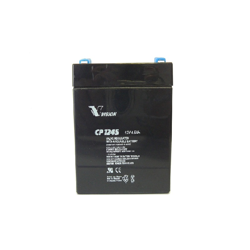 Vision CP1245K Sealed Lead Acid Battery rechargeable batteries are lead-lead dioxide systems. The dilute sulfuric acid electrolyte is absorbed by separators and plates and thus immobilized. Should the battery be accidentally overcharged producing hydrogen and oxygen, special one-way valves allow the gases to escape thus avoiding excessive pressure build-up. Otherwise, the battery is completely sealed and is, therefore, maintenance-free, leak-proof and usable in any position.