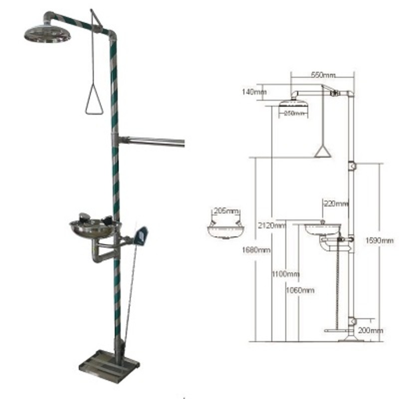 High quality Stainless steel 304. Shower value is makin of 1? stainless steel 304 ball valve. Eye washer valve is making of 1/2? stainless steel 304 ball valve. Water supply & outlet: 1-1/4? IPS. Water working pressure: 0.2MPA-0.8MPA. Flow control: 76L/Min. Original water: Clean water or leached water. Activation: Shower is activated by pull rod. Eye washer is activated by flag handle or foot treadle.