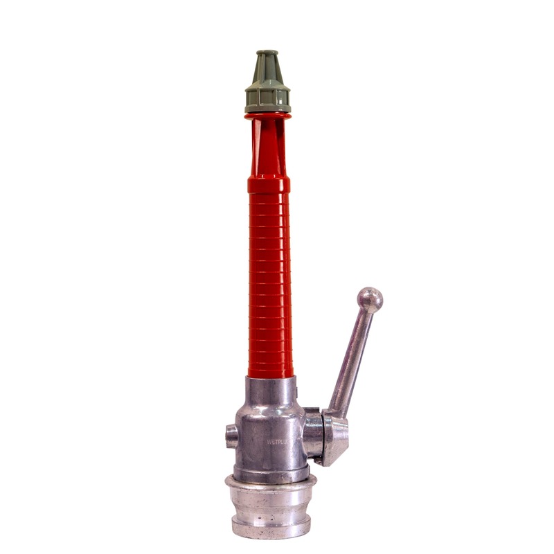 Wetplug hand-held branch pipe is made by combination of aluminium and plastics. The water flow control is by means of Shut off, Jet, Spray, ball valve. The branch pipe has male instantaneous coupling inlet.