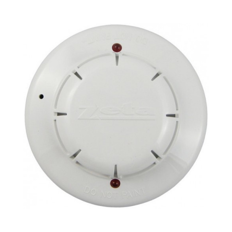 The Zeta MKII-OP smoke detector features ionization chamber technology for fast flame detection. Includes FEII-CB mounting base with screw terminals for easy installation. Features test button, low battery warning, and interconnects with up to 24 devices.